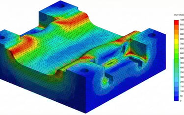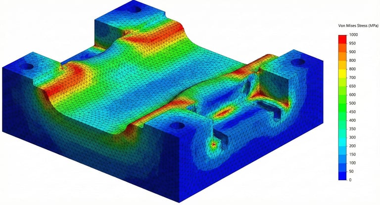 Validação estrutural de ferramenta de alta performance. A simulação mapeia os pontos de máxima tensão (Hotspots) nas cavidades internas, permitindo o redimensionamento dos raios e da estrutura para suportar ciclos de alta tonelagem sem risco de trincas prematuras ou quebra catastrófica.