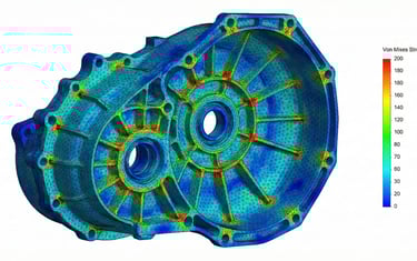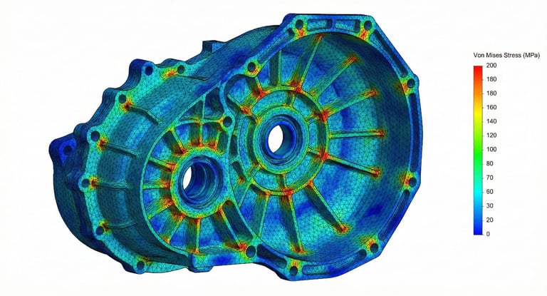 Alívio de peso inteligente sem perda de resistência. A análise computacional permitiu remover material desnecessário (reduzindo o custo de fundição) enquanto manteve a rigidez estrutural exata para suportar os esforços das engrenagens e rolamentos.