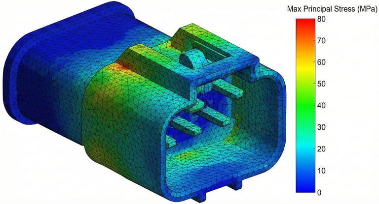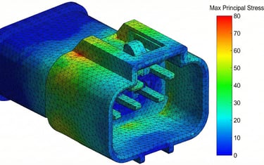 Validação do sistema de trava (clipe). A simulação garante que o conector suporte a força de montagem sem deformação permanente ou quebra das travas plásticas. Essencial para evitar falhas na linha de produção e garantir a conexão elétrica perfeita durante a vida útil do produto.