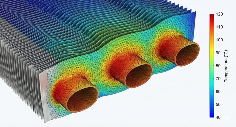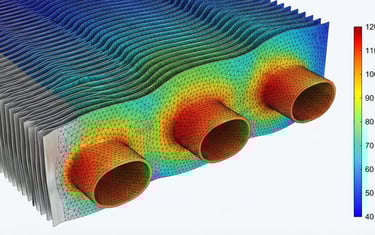 Mapeamento completo da distribuição de temperatura. A simulação identificou gradientes térmicos críticos nos tubos, permitindo otimizar o fluxo para garantir máxima eficiência na troca de calor e evitar falhas prematuras por fadiga térmica ou superaquecimento localizado.