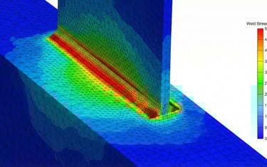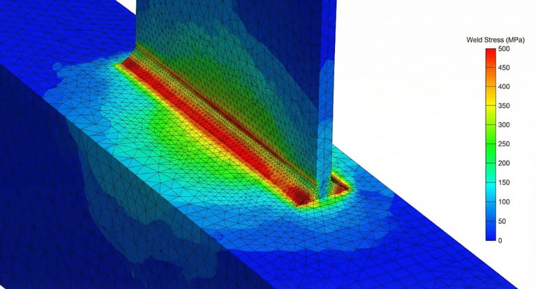 Definição exata da espessura da chapa. A simulação identificou as zonas críticas de tensão na junta (em vermelho), permitindo ajustar o material para garantir que a peça suporte a carga máxima sem sofrer deformação permanente. O resultado é um componente mais leve e barato de fabricar.