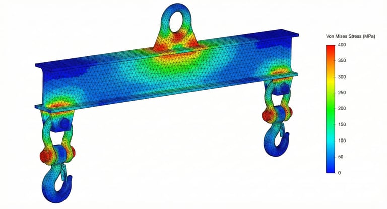 Validação estrutural completa para operações de carga crítica. Utilizamos simulação FEA para garantir o Fator de Segurança exigido pelas normas regulamentadoras (NR-11). O estudo identificou e reforçou os pontos de tensão nos olhais e soldas, entregando um equipamento 100% seguro e documentado.