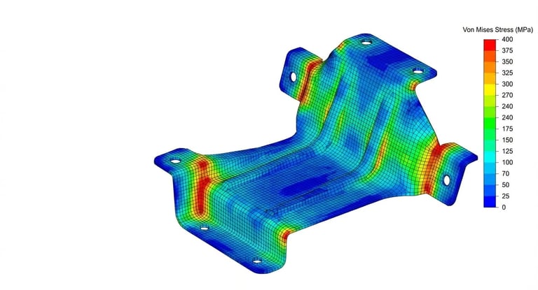 Definição exata da espessura da chapa. A simulação identificou as zonas críticas de tensão na dobra (em vermelho), permitindo ajustar o material para garantir que a peça suporte a carga máxima sem sofrer deformação permanente. O resultado é um componente mais leve e barato de fabricar.